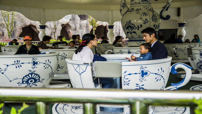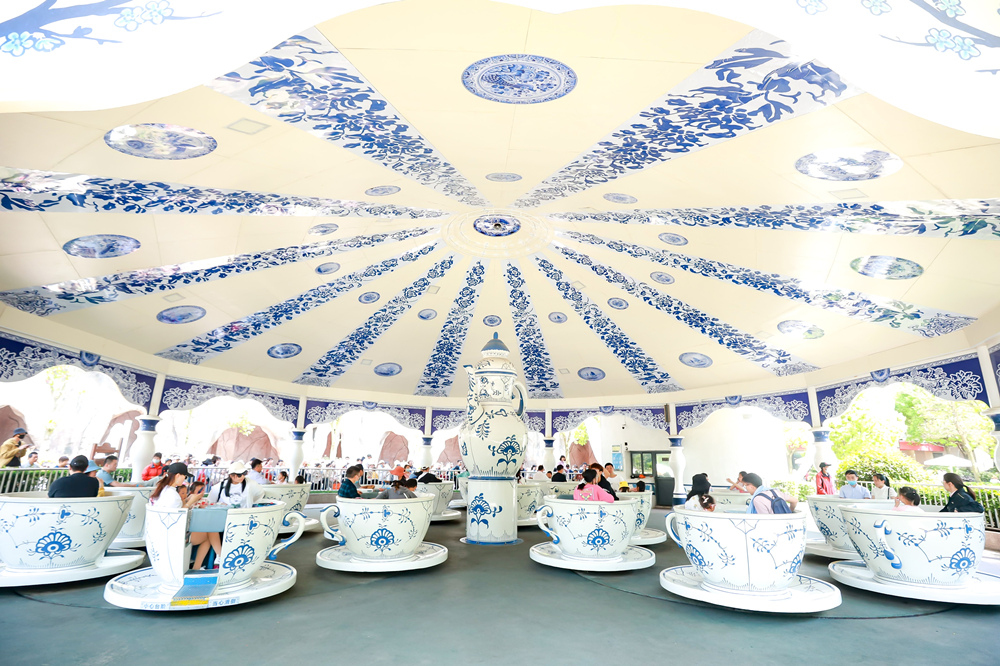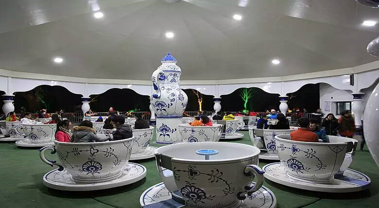 天青色青花瓷剔透着古典的美,宛如烟雨轻拂的南京古城,舞动着一种古朴的中国风跃然而生。独具中国风的6个青花陶瓷茶杯围绕着茶壶转动,另外茶杯围绕自己的中心转动,就像游客跳着双人舞蹈般的情境,给游客带来多重旋转的乐趣。