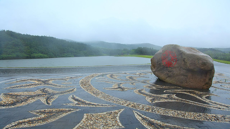 池中矗立的是银杏湖的吉祥物,Q版的龙、凤。游客们可以在出口商业街带上这2个可爱的吉祥物回家。